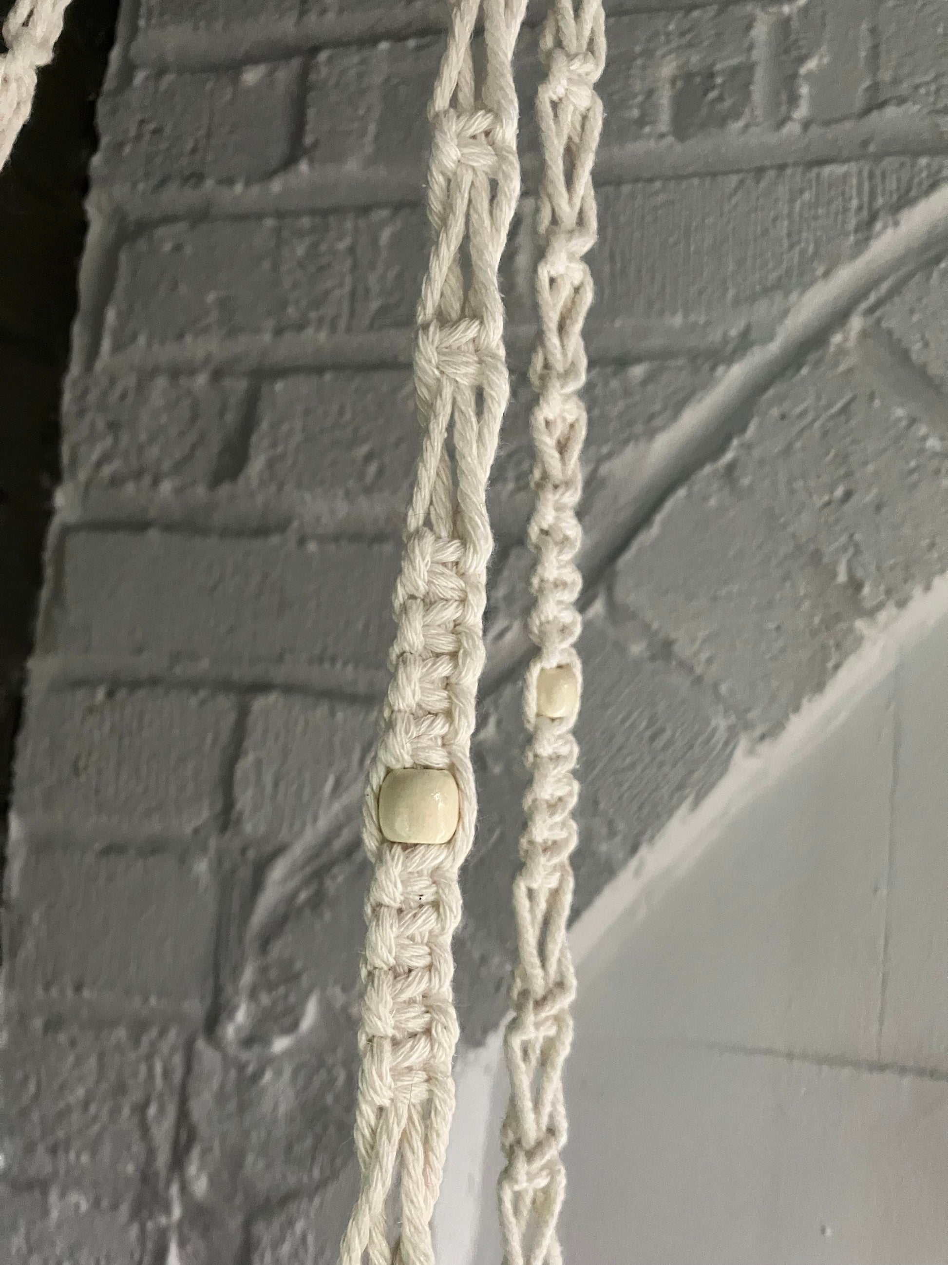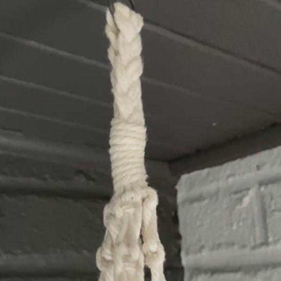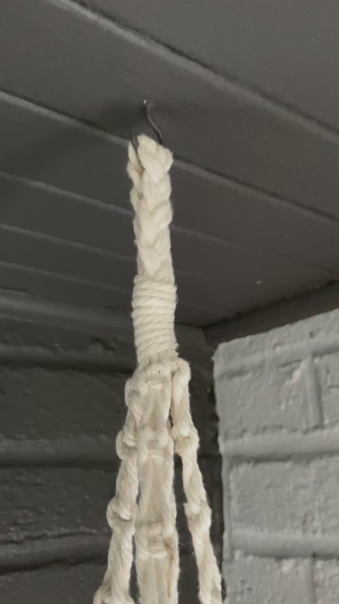 A custom macrame hanging basket. Basket is made of a plywood crate.