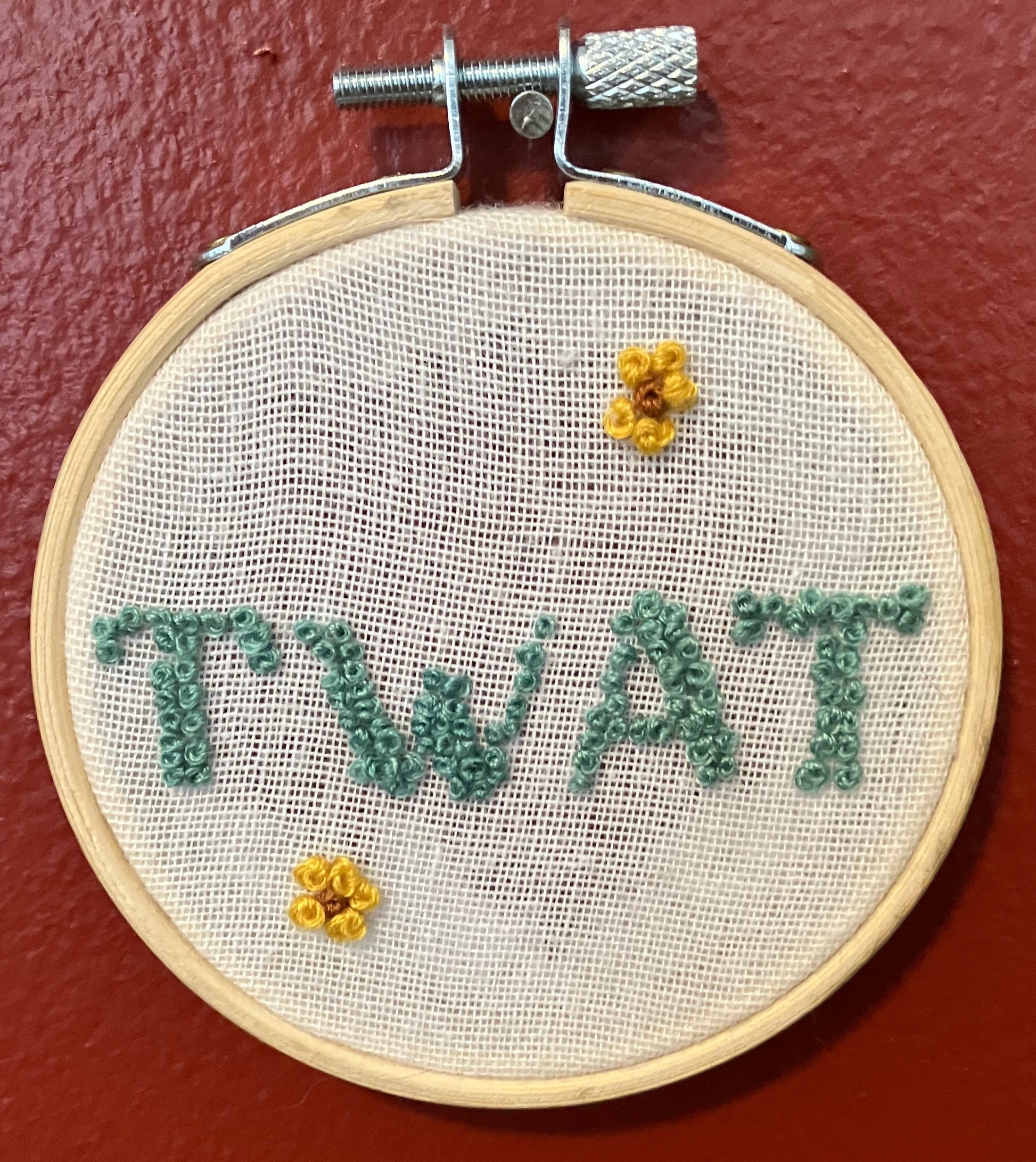 A 3 inch light brown wood embroidery hoop with white fabric stretched in it. In chunky pastel turquoise lettering it says "TWAT". It has two golden yellow flowers on the outside of the lettering.